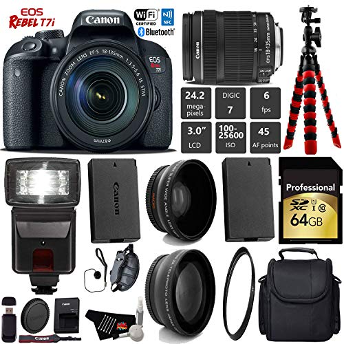 Product Highlights: 24.2MP APS-C CMOS Sensor DIGIC 7 Image Processor 3.0" 1.04m-Dot Vari-Angle Touchscreen Full HD 1080p Video Recording at 60 fps 45-Point All Cross-Type Phase-Detect AF Dual Pixel CMOS AF Up to 6 fps Shooting and ISO 51200 Built-In Wi-Fi with NFC, Bluetooth HDR Movie and Time-Lapse Movie EF-S 18-135mm f/3.5-5.6 IS STM Lens Canon Rebel T7i Overview: Packing a versatile feature-set in a sleek and portable body, the EOS Rebel T7i DSLR from Canon offers advanced imaging capabilities along with a convenient range of controls and connectivity. Bundle Includes: Canon EOS Rebel T7i DSLR Camera Canon EF-S 18-135mm f/3.5-5.6 IS STM Lens Professional Flash UV Protection Lens 0.43x High Definition Wide Angle Conversion Lens 2.2x Telephoto Conversion Lens 64GB SDXC Class 10 Secure Digital High Speed Memory Card Replacement Battery For LP-E17 Lithium-Ion Battery Pack Wrist Strap Deluxe Digital Camera/Video Padded Carrying Case Flexible Tripod Lens Cap Keeper High-Speed Card Reader Lens Tissue Paper Cotton Swabs Lens Cleaning Solution 6 Ave MicroFiber Cloth In the Box: LP-E17 Battery Pack LC-E17 Charger Eyecup EF RF-3 Body Cap EW-400D Wide Strap Brand New. Includes Manufacturer's Supplied Accessories & One Year Seller Supplied Warranty.