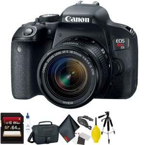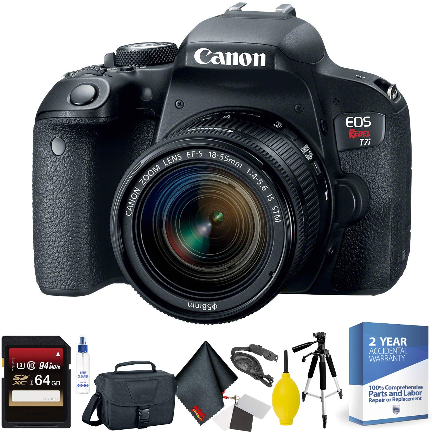 Canon EOS Rebel T7i DSLR Camera with 18-55mm Lens Overview:Packing a versatile feature-set in a sleek and portable body, the EOS Rebel T7i DSLR from Canon offers advanced imaging capabilities along with a convenient range of controls and connectivity. Utilizing a 24.2MP APS-C CMOS sensor and DIGIC 7 image processor, the Rebel T7i is able to capture high-resolution stills and video with an expanded sensitivity range of ISO 100-51200 to suit working in a wide variety of lighting conditions. The sensor and processor combination also avails 6 fps continuous shooting for working with moving subjects. Benefitting the imaging attributes, the sensor's design also facilitates Dual Pixel CMOS AF, which uses phase-detection autofocus for quick, accurate, and smooth focusing performance when recording movies or shooting stills in live view. When shooting stills using the optical viewfinder, a 45-point all cross-type phase-detection system is used for quick and accurate focusing in a variety of shooting scenarios.24.2MP APS-C CMOS SensorDIGIC 7 Image Processor3.0" 1.04m-Dot Vari-Angle TouchscreenFull HD 1080p Video Recording at 60 fpsWhat's In The Box:Canon EOS Rebel T7i DSLR Camera with 18-55mm Lens EF-S 18-55mm f/4-5.6 IS STM Lens LP-E17 Lithium-Ion Battery Pack LC-E17 Charger for LP-E17 Battery Pack Eyecup Ef for Digital Rebel Cameras Body CapEW-400D Wide Strap Limited 1-Year Warranty Items Included With Your Purchase:1 x 64GB Memory Card1 x SD Card Reader1 x Fibercloth1 x Camera Cleaning Kit1 x Memory Card Wallet1 X Lens Cap Keeper1 x Tripod1 x Dust Blower1 x Handstrap1 x Set of White Balance CardsSpecial 2 Year Warranty Covering Accidents, Parts, and Labor