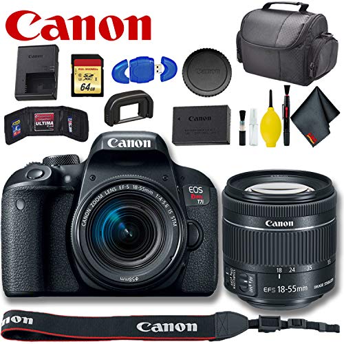 Packing a versatile feature-set in a sleek and portable body, the EOS Rebel T7i DSLR from Canon offers advanced imaging capabilities along with a convenient range of controls and connectivity. Utilizing a 24.2MP APS-C CMOS sensor and DIGIC 7 image processor, the Rebel T7i is able to capture high-resolution stills and video with an expanded sensitivity range of ISO 100-51200 to suit working in a wide variety of lighting conditions. The sensor and processor combination also avails 6 fps continuous shooting for working with moving subjects. Benefitting the imaging attributes, the sensor's design also facilitates Dual Pixel CMOS AF, which uses phase-detection autofocus for quick, accurate, and smooth focusing performance when recording movies or shooting stills in live view. When shooting stills using the optical viewfinder, a 45-point all cross-type phase-detection system is used for quick and accurate focusing in a variety of shooting scenarios.Bundle Items Included:Canon EOS Rebel T7i DSLR CameraEF-S 18-55mm f/4-5.6 IS STM LensLP-E17 Lithium-Ion Battery PackLC-E17 Charger for LP-E17 Battery PackEyecup EFRF-3 Body Cap for Canon EOS CamerasEW-400D Wide StrapMicrofiber ClothLens Cleaning KitCarry Case64GB MemoryMemory Card WalletUSB Card Reader