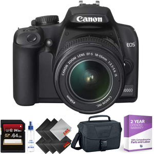 Canon EOS Rebel XS SLR Digital Camera (Black) with 18-55mm IS Lens Kit Overview:The Canon EOS Rebel XS Digital Camera incorporates a number of high-end functions and technology found in Canon's professional SLR models, including an improved autofocus sensor, and an advanced Live View function. Plus the proprietary DIGIC III image processor ensures that the fine details and natural colors of the images are optimally recorded, and also manages the camera's efficient energy consumption and high-speed signal processing performance.10 Megapixel2.5" LCD MonitorLive View Function3.0 fps Continuous ShootingWhat's In The Box:Canon EOS Rebel XS SLR Digital Camera (Black) with 18-55mm IS Lens KitEF-S 18-55mm f/3.5-5.6 IS II LensFront & Rear Lens CapsLP-E5 Rechargeable Lithium-Ion Battery Pack (7.4V, 1080mAh)LC-E5 Battery ChargerIFC-200U USB Interface CableVC-100 Video CableEf EyecupEW-100DBIII Wide Neck StrapEOS Digital Solution Disk and Instruction Manuals on CD-ROM"Great Photography is Easy" Booklet and "Do More with Macro" Booklet1-Year Manufacturers Limited Warranty (U.S.A. & Canada)Items Included With Your Purchase:1 x 64GB Memory Card1 x SD Card Reader1 x Fibercloth1 x Camera Cleaning Kit1 x Memory Card Wallet1 X Lens Cap Keeper