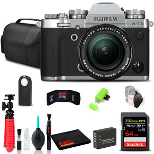FUJIFILM X-T3 Camera + 18-55mm Lens (Silver) + 64GB SD Card + Extra Battery