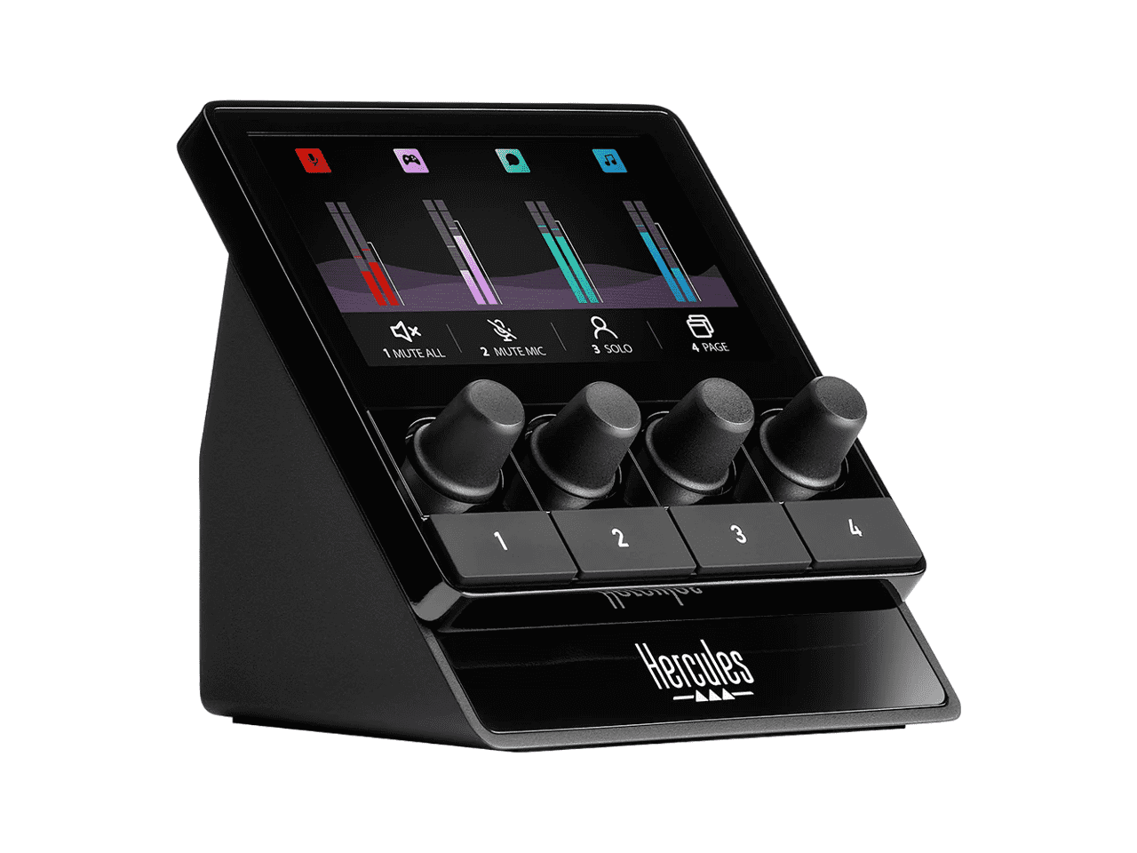 Hercules Stream 100 is an easy-to-use and effective audio controller that lets you stop worrying about audio settings during your livestreams and react quickly. Thanks to this audio controller with a built-in LCD screen, you can manage all your audio sources in real time: games, chat software, music, USB microphone, and more. Hercules Stream 100 lets you individually view and control the sound level of each audio track directly onscreen. Instantly enable, turn down the volume, turn up the volume, mute or unmute the sound! More than an audio controller, Hercules Stream 100 is also a command center: you’ll love using the 4 handy assignable action buttons to customize your controls (multiple mute, URL launcher, scene change…).