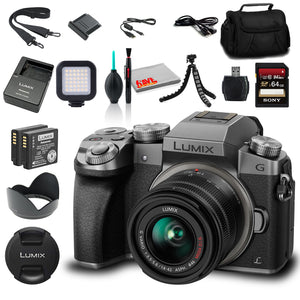 Offering true recording versatility, the silver Panasonic Lumix DMC-G7 is a true hybrid mirrorless camera that blends 4K UHD video with advanced still capture and burst shooting capabilities. Revolving around a 16 MP Live MOS Micro Four Thirds sensor and Venus Engine 9 image processor, the G7 features notable low-light sensitivity to ISO 25600, continuous shooting to 8 fps with single-shot AF, as well as a trio of 30 fps shooting rates based on the 4K UHD video recording. Complementing the fast burst shooting modes is an equally adept DFD autofocus system, which works to quicken focusing speeds and emphasize accurate subject tracking for consistently sharp imagery in fast-paced and trying working conditions. Rounding out the feature-set of the G7 is a contemporary body design accentuated by physical exposure control dials, six customizable function buttons, both a high-resolution EVF and 3.0" tilting touchscreen LCD, and built-in Wi-Fi for wireless sharing and remote camera control. Bridging the gap between stills and video, the Lumix DMC-G7 pairs these two high-resolution mediums with refined focusing and shooting controls for the utmost in shooting versatility.Manufacturer Included Items:Panasonic Lumix DMC-G7 Mirrorless Micro Four Thirds Digital Camera with 14-42mm Lens (Silver)Lumix G Vario 14-42mm f/3.5-5.6 II APSH. MEGA O.I.S. Lens (Silver)Front Lens CapRear Lens CapLens HoodRechargeable Lithium-Ion BatteryBattery ChargerBody CapHot Shoe CoverShoulder StrapUSB Connection CableAC CableSoftware DVD-ROMBundle Items Include:1 x Panasonic Lumix DMC-G7 Mirrorless Micro Four Thirds Digital Camera with 14-42mm Lens (Silver)1 x 64GB High Speed UHS-I SDXC U3 Memory Card1 x Portable LED Video Light1 x Lithium Ion Rechargeable DMW-BLC12 Battery1 x Deluxe Soft Medium Camera and Video Case Bag