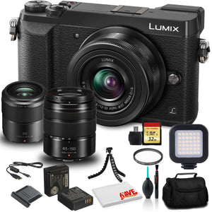 An all-around Micro Four Thirds camera designed for photographers and videographers, the black Lumix DMC-GX85 from Panasonic features a compact build and intuitive layout, along with a feature-set to suit a multimedia lifestyle. Utilizing a 16MP Live MOS sensor, which lacks an optical low-pass filter for increased sharpness, the GX85 is capable of shooting continuously at up to 10 fps with single-shot autofocus, or 6 fps with continuous autofocus, as well as up to 40 fps when using an electronic shutter function. UHD 4K video recording is also supported in 30 and 24 fps frame rates, as well as Full HD 1080p, and the 4K recording abilities also permit shooting 8MP stills at a 30 fps rate. A sensitivity range up to ISO 25600 permits working in difficult and low-light settings while 5-axis sensor-shift image stabilization also helps to minimize the appearance of camera shake for sharper handheld shooting. Spanning a broad range of features for both still and moving images, the GX85 is a versatile mirrorless camera further characterized by its sleek form factor and connected functionality.Manufacturer Included Items:Panasonic Lumix DMC-GX85 Mirrorless Micro Four Thirds Digital Camera with 12-32mm and 45-150mm Lenses (Black)Panasonic Lumix G Vario 12-32mm f/3.5-5.6 ASPH. LensPanasonic Lumix G Vario 45-150mm f/4-5.6 ASPH. MEGA O.I.S. LensRechargeable Lithium-Ion BatteryAC AdapterUSB Connection CableShoulder StrapHot Shoe CoverBundle Items Include:1 x Panasonic Lumix DMC-GX85 Mirrorless Micro Four Thirds Digital Camera with 12-32mm and 45-150mm Lenses (Black)1 x Panasonic Lumix G 25mm f/1.7 ASPH. Lens1 x Portable LED Video Light1 x DMW-BLE9 Lithium-Ion Battery1 x High Speed 32GB Memory Card1 x Deluxe Soft Medium Camera Case Bag1 x 12 Inch Flexible Tripod1 x Deluxe Cleaning Set1 x USB Card Reader