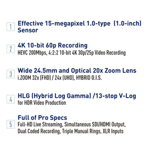 The Panasonic Camcorder HC-X2 video recorder offers 20x optical zoom, 24.5mm wide angle for both UHD and FHD, 4K high-precision AF with new face detection and higher precision, 5-Axis HYBRID O.I.S.+, high brightness LCD, and more. For video recording, the HC-X2 supports 4:2:2 10-bit 4K 30p/25p internal video recording and the new, high-efficiency HEVC codec, with with a wide variety of recording formats for the best selections such as Super Slow Motion (120/100 fps) and VFR (2 to 60 fps). With built-in Wi-Fi, direct connection to Ethernet, and HLG Gamma Mode and 13-stop V-Log for production of 4K HDR video content