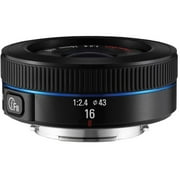 Samsung 16mm f/2.4 Ultra Wide Pancake Lens (Black) with Two Aspherical Elements, 7-Blade Circular Aperture Design, i-Scene Support, i-Function Support, f/2.4 to 22 Aperture Range and 82.6° Angle of View.