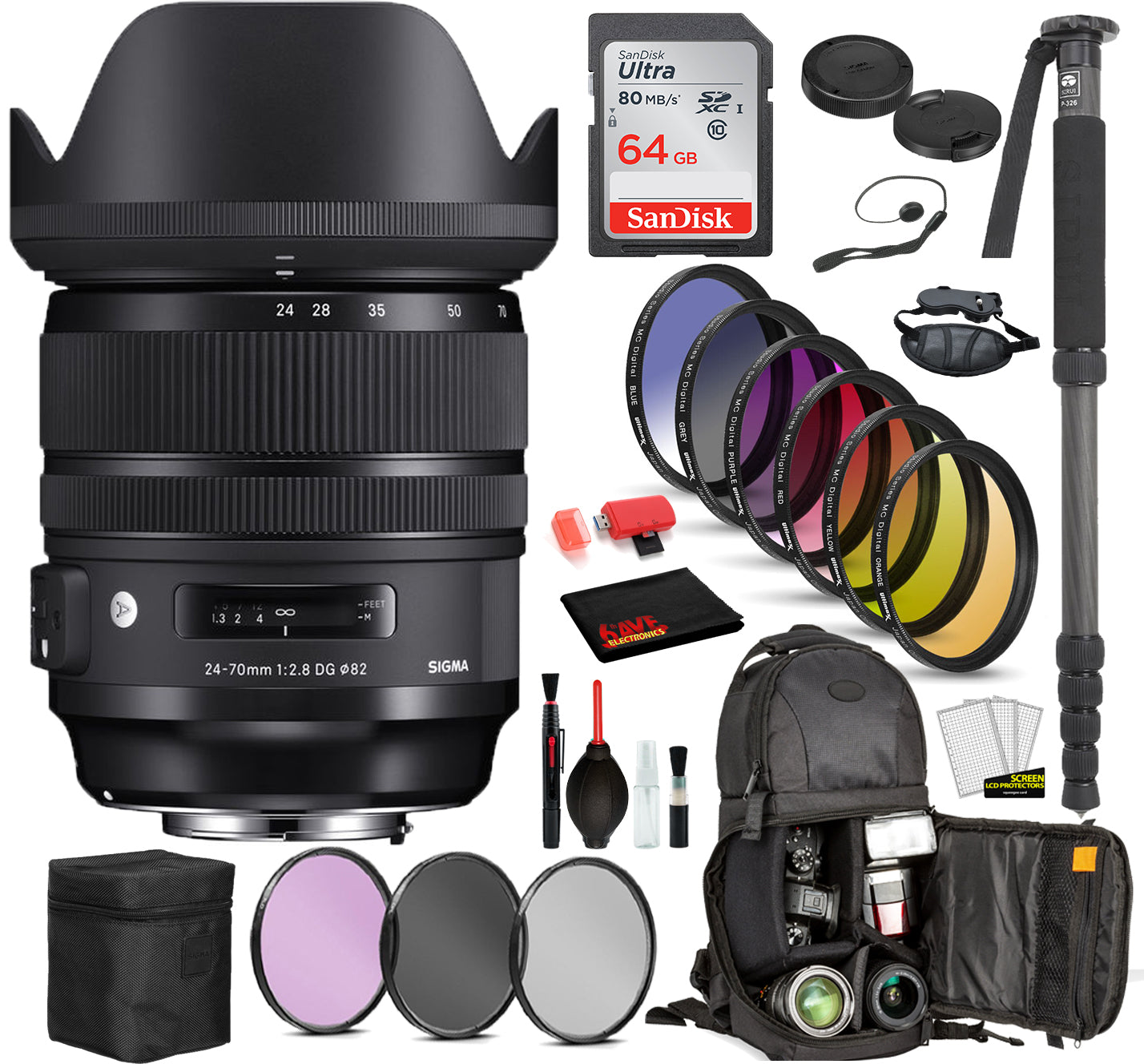 Sigma 24-70mm f/2.8 DG OS HSM Art Lens for Canon EF with Bundle Includes: Sandisk 64gb SD Card, 9PC Filter Kit + More