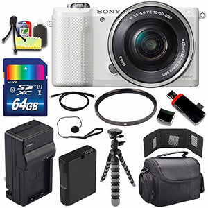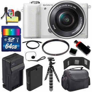 Our Kit Includes:- Sony Alpha a5000 Mirrorless Digital Camera with 16- 50mm Lens (White) w/ All Manufacturer Accessories- Extra Rechargeable Lithium Ion Replacement Battery- External Rapid Quick, Travel Charger with Car Charger Attachment- 64GB SDXC Class 10 High Speed Memory Card- Ultraviolet UV Filter - Deluxe Padded Carrying Case With Strap- 12-Inch Flexible Tripod with Gripping Rubber Legs- High Speed Gold Plated MINI HDMI Cable 6 feet- USB SDHC Memory Card Reader?- Memory Card Wallet- Lens Cap Keeper- Pack of LCD Screen Protectors + Lens/LCD Maintenance Cleaning Kit + Mini Table Top Tripod