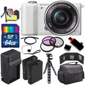 Our Kit Includes:- Sony Alpha a5000 Mirrorless Digital Camera with 16- 50mm Lens (White) w/ All Manufacturer Accessories- Two Extra Rechargeable Lithium Ion Replacement Battery- External Rapid Quick, Travel Charger with Car Charger Attachment- 64GB SDXC Class 10 High Speed Memory Card- 3 Piece Filter Kit Includes: UV, Circular Polarizer and Flourescent Filter and Hard Case- Deluxe Padded Carrying Case With Strap- 12-Inch Flexible Tripod with Gripping Rubber Legs- High Speed Gold Plated MINI HDMI Cable 6 feet- USB SDHC Memory Card Reader?- Memory Card Wallet- Lens Cap Keeper- Pack of LCD Screen Protectors + Lens/LCD Maintenance Cleaning Kit + Mini Table Top Tripod